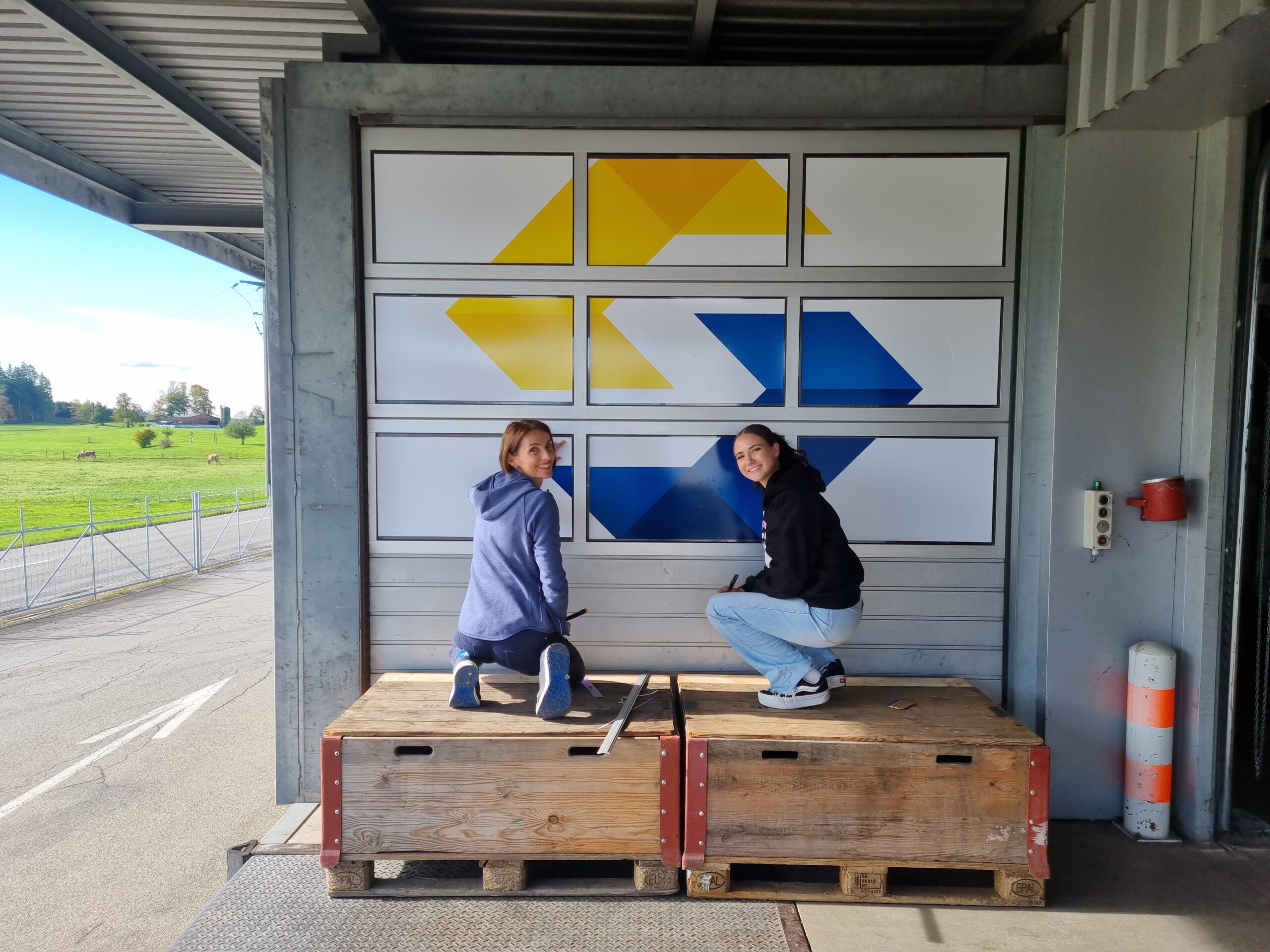 Nina und Jana haben das schöne Wetter genutzt und das kaputte Rolltor an der Logistik in sorgfältiger Handarbeit und mit gutem Auge mit Klebefolien überdeckt. Nun ist statt der alten Plexiglasscheiben unser Steinemann “S” zu sehen.